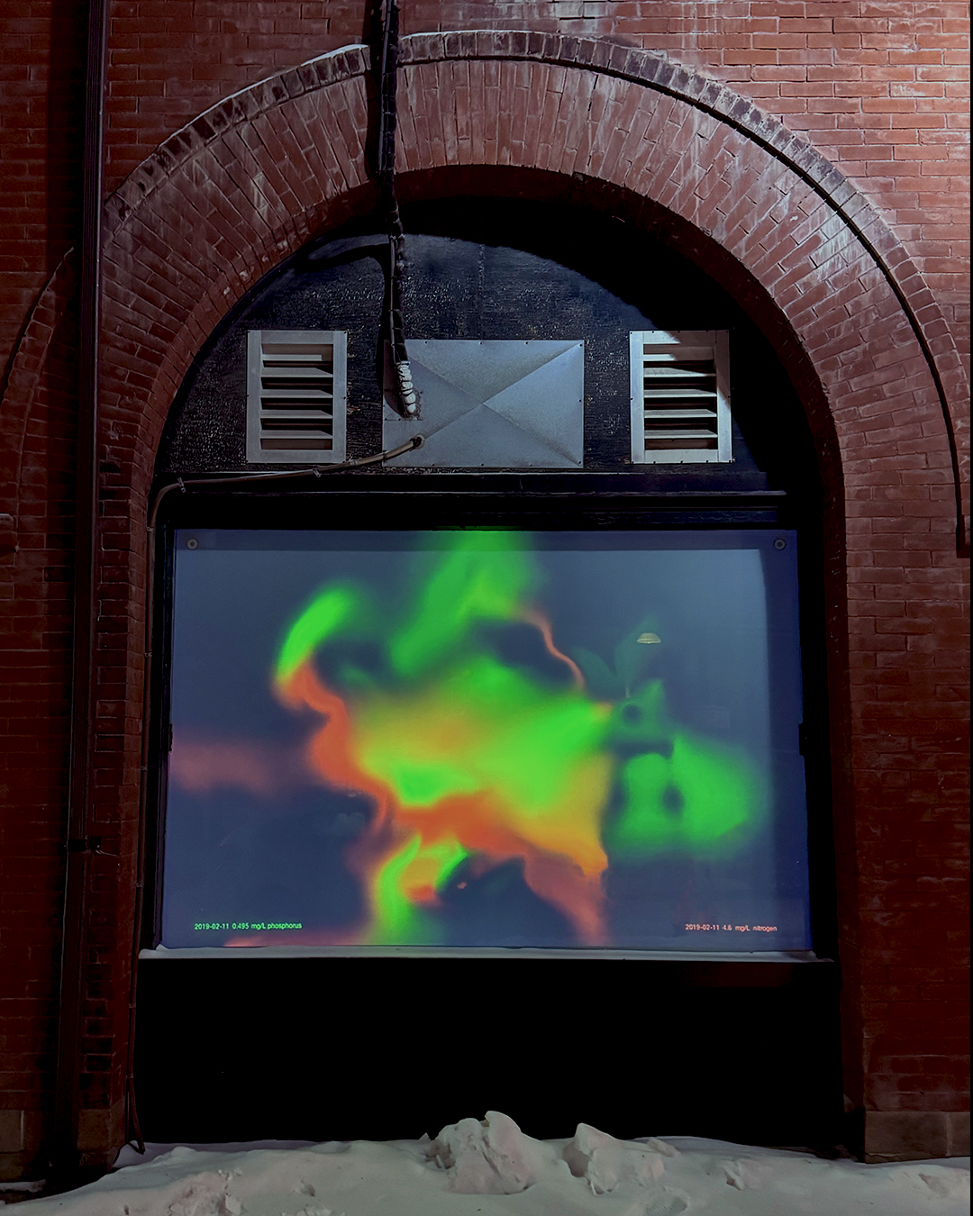Regress Bloom is a multilayered representation of open data interpretations covering fifteen years of nitrogen and phosphorus testing on the Red River (GPS Coordinates: 50.1411, -96.86861) in Selkirk, Manitoba. It is a research project that represents a specific set of data points, filtered through technologies, human decision-making, creative translation, and audience observations. Peripherally, Regress Bloom is an exploration of algorithmic reinforcement, ‘filter bubbles’, and the human biases in digital systems development.